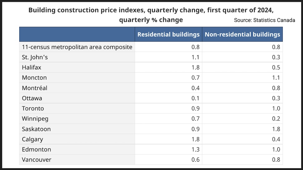 Halifax (+8.1%) led the year-over-year growth in construction costs for residential buildings, while Moncton (+7.9%) led the growth of non-residential buildings.