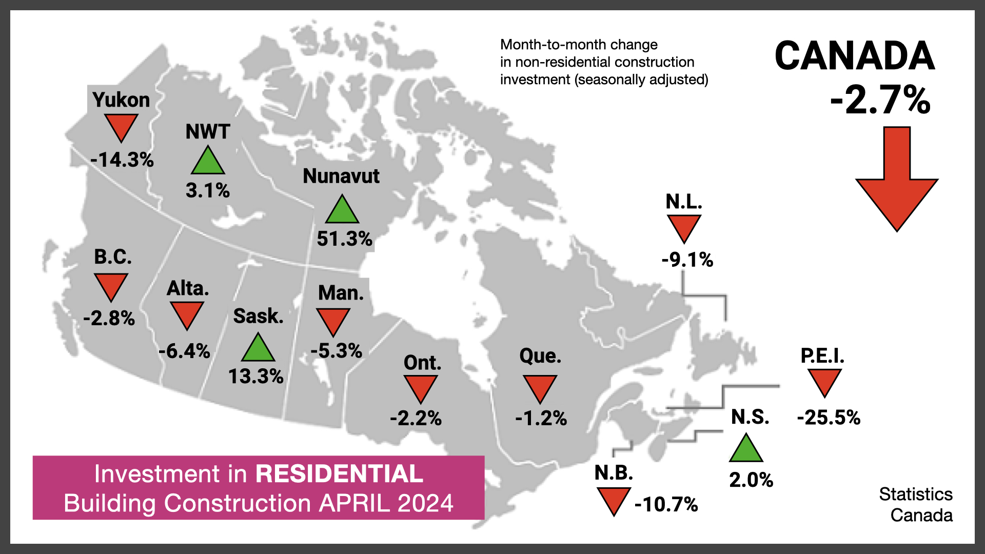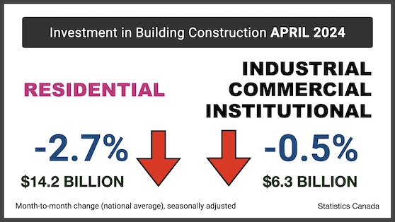 June 17, 2024 – Investment in building construction took a dive across both non-residential and residential sectors overall, although many individual components saw growth.