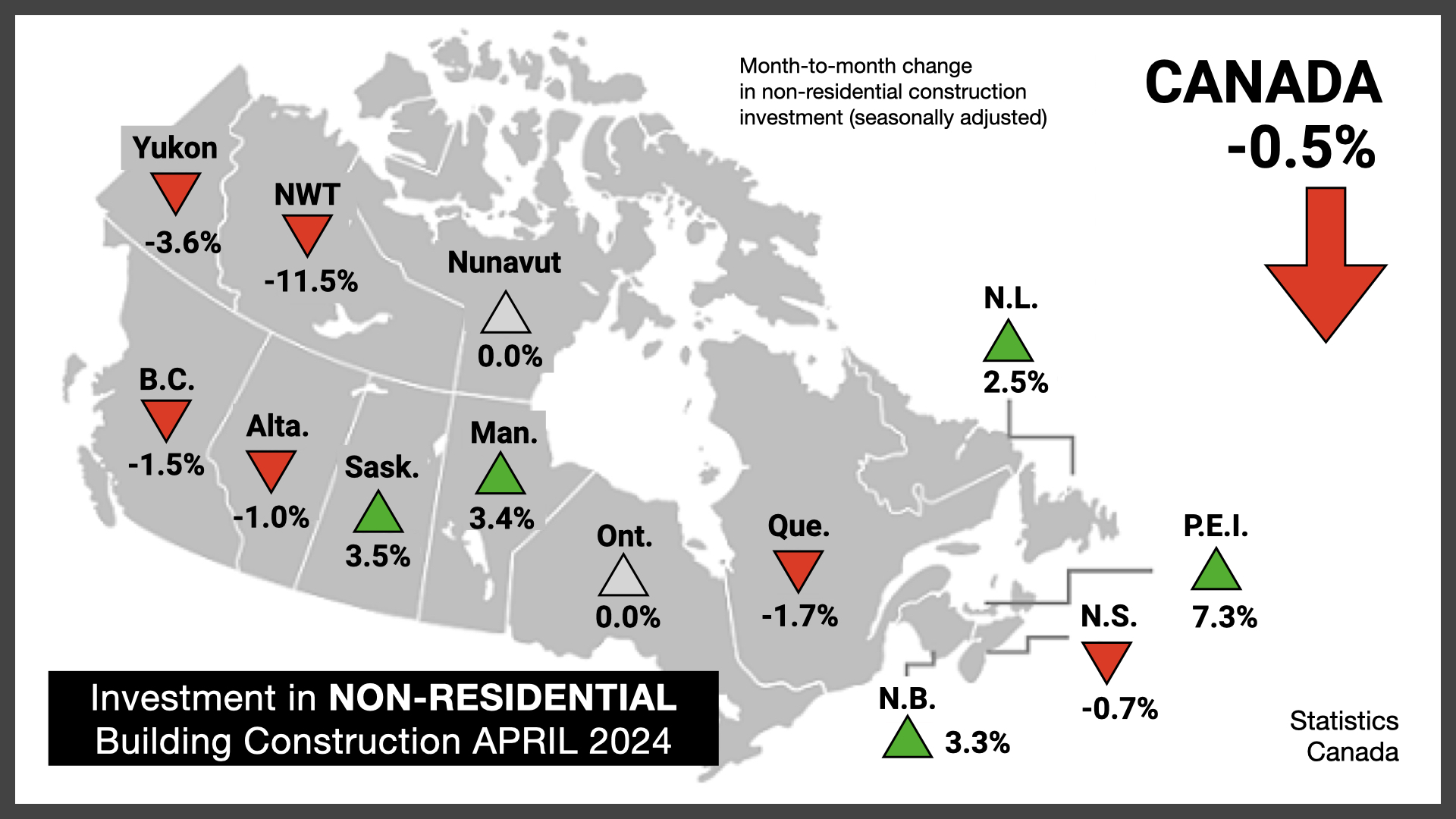 Investment in non-residential construction edged down by $31.2 million (-0.5%) to $6.3 billion in April, reports Statistics Canada.