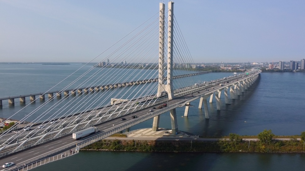 One of the largest infrastructure projects in North America, the Samuel-De Champlain Bridge was built to replace the original Champlain Bridge over the Saint Lawrence River in Montreal and is the widest cable-stayed bridge in the world that uses two planes of cables. The new multimodal crossing provides eight lanes of automobile traffic, two bus lanes and a multi-use lane for cyclists and pedestrians. The central portion of the Champlain Bridge deck will carry the South Shore branch of the REM automated light metro system.